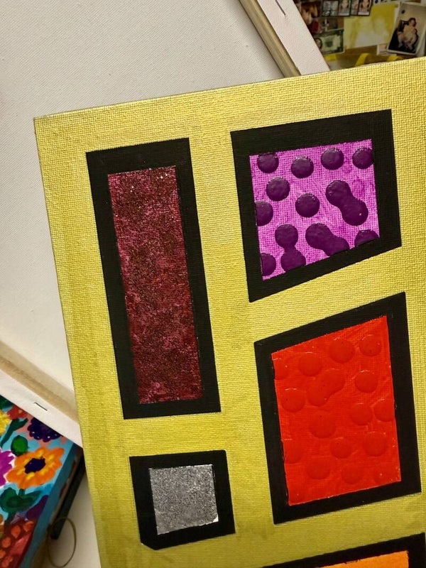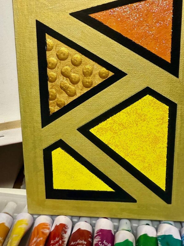 N. 0000013: Geometrix è un dipinto del 13 Aprile del 2016. Dipinto con tecnica mista su cartone telato di 30x40 cm. Sono stati usati colori acrilici e pennarelli uni posca. Vernice color oro e brillantini colorati.