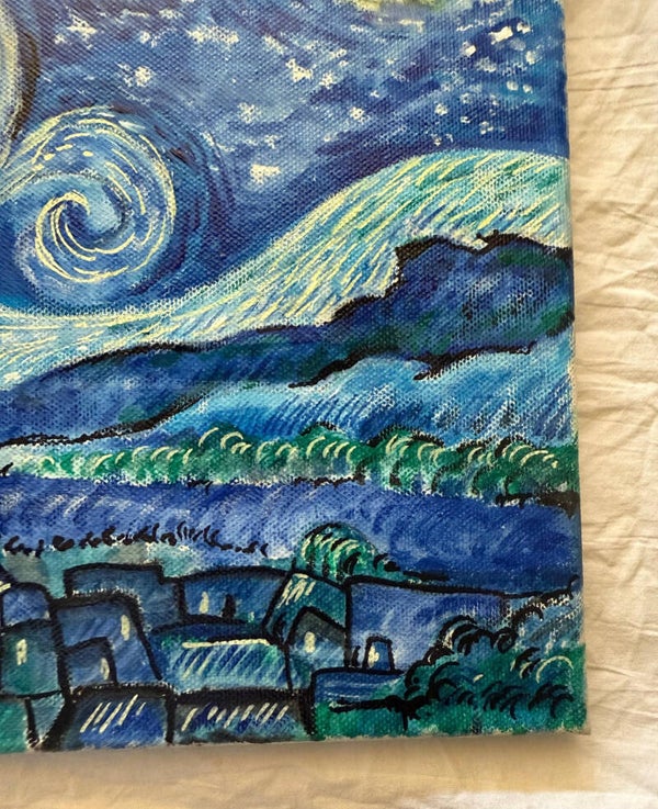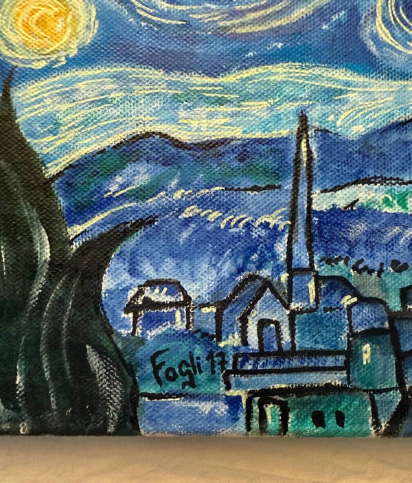 N. 0000014: NOTTE STELLATA è un dipinto del 18 Maggio del 2017. Dipinto con tecnica mista su tela di 30x40 cm. Sono stati usati colori acrilici e pennarelli uni posca.